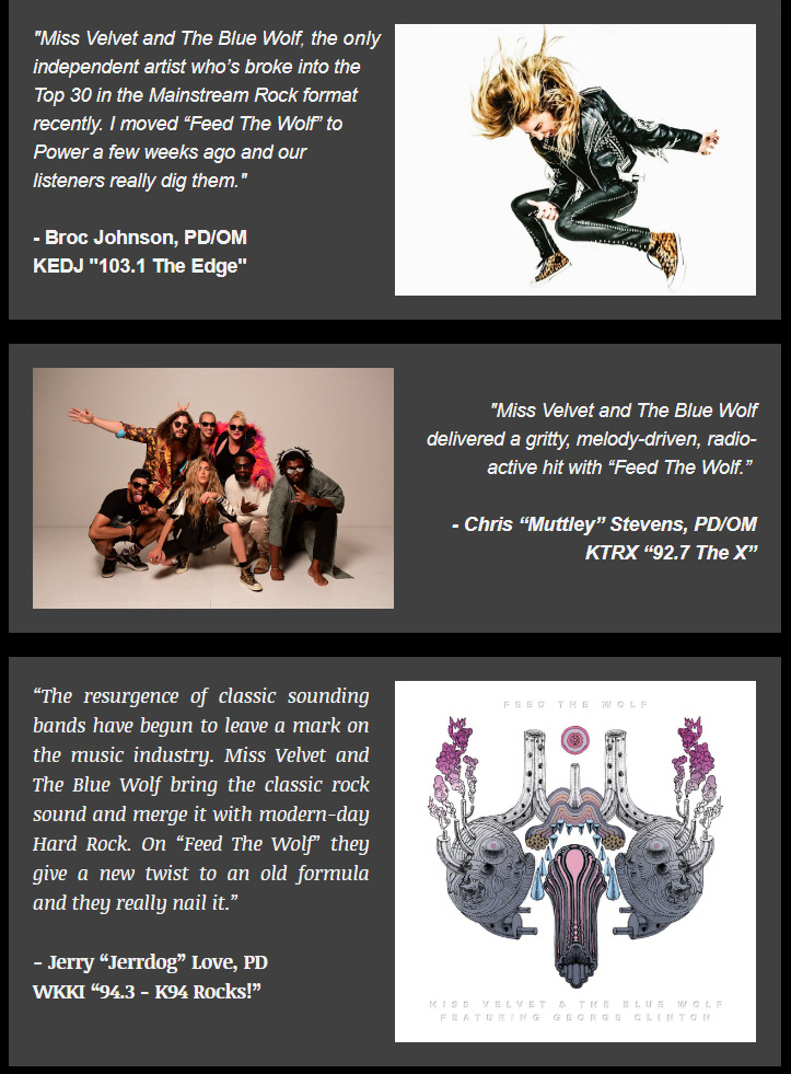 “Miss Velvet and The Blue Wolf are a ridiculously brilliant crew who are obviously on their way to big things. Together, they make music that builds on the greatness of the past but turns it into a cutting-edge, relevant sound meant for 21st Century ears. This isn’t old school funk, rock, or anything else. Miss Velvet & The Blue Wolf are 100% now and happening as we speak. Feed The Wolf is all about the new style and you’re going to love it.” — Mike O’Cull